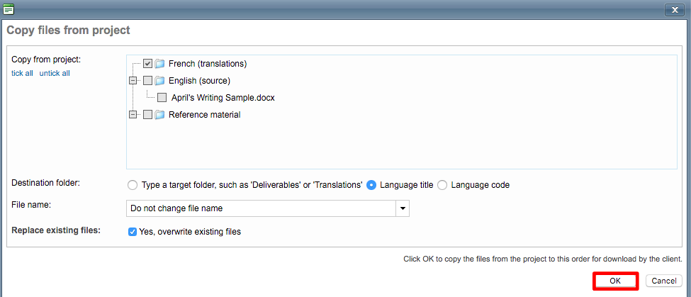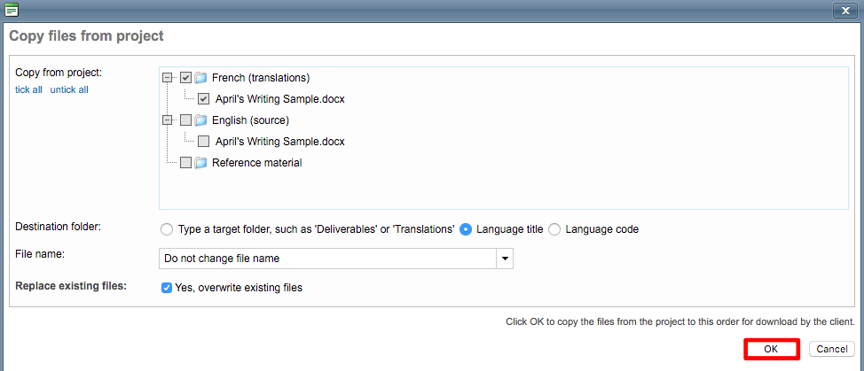 Choose the files you would like to copy from the project by ticking the checkbox next to each file name. You may also configure the destination folder, change the file name, and disable the option for overwriting existing files. Once finished, click on OK.