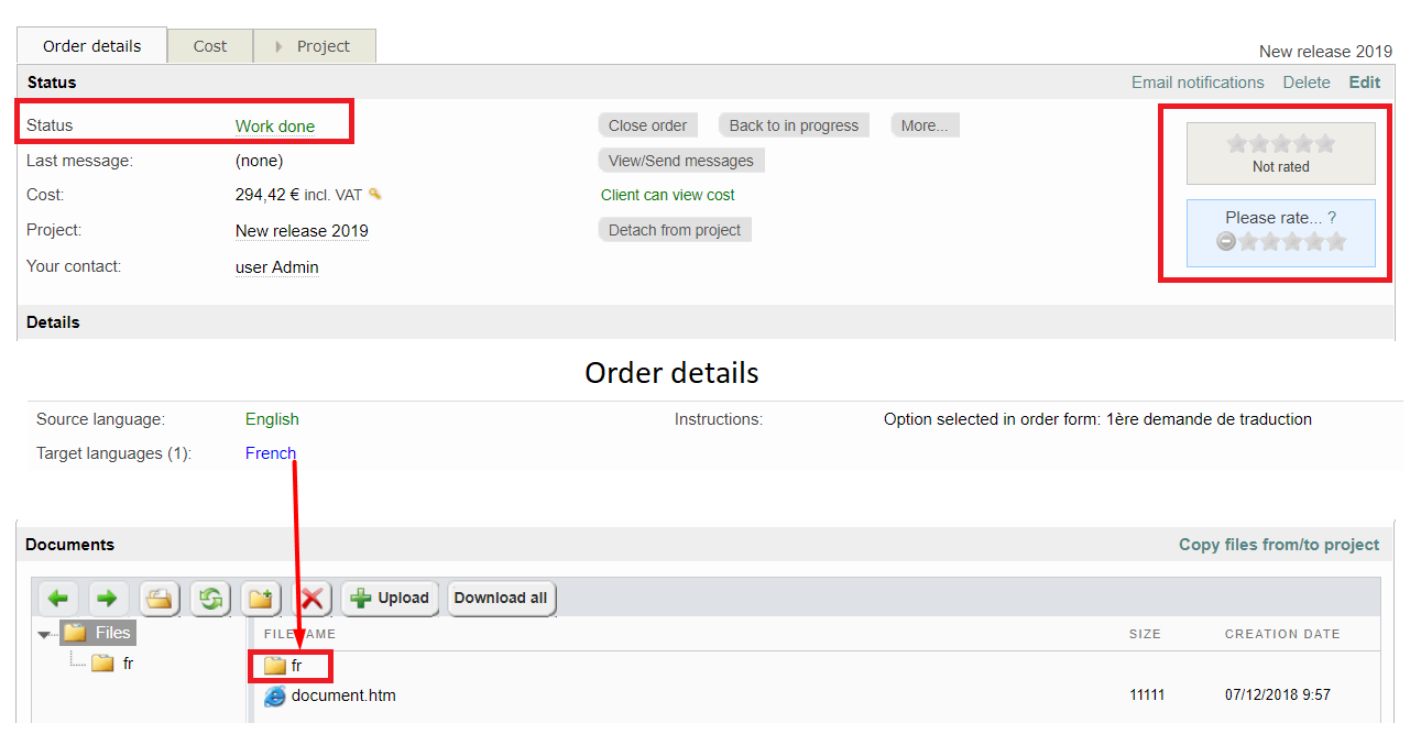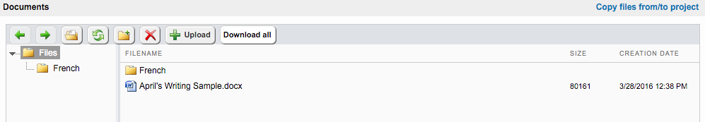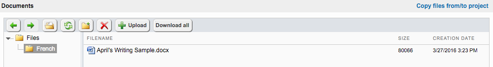 Folders for each language will be added in the documents section and you will be able to see each file that was copied from the project. Once this step is completed, you will be able to mark the work as done so the client can review the work and approve it.