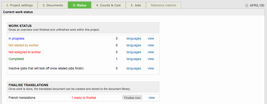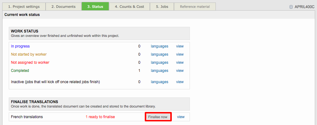 As with an automated ordering process, the completed translations will need to be finalised. Click on the Status Tab when viewing the project and then click on Finalise Now next to each finished translation.