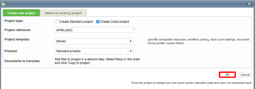 Tick the radial next to Create Codyt Project in the pop-up window. Enter a project reference if desired, select a template if one is available in the system, and choose the pricelist to be used for cost calculation. Then click on OK to finish.