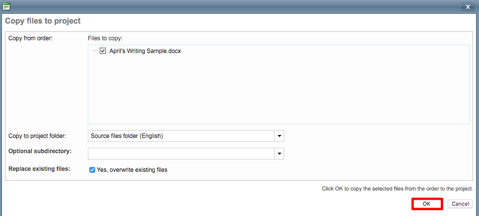 After the completed translations have been finalised, the finished documents must then be copied from the project to the order. To do so, complete these steps: