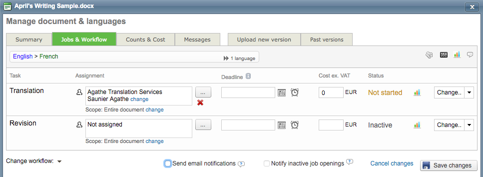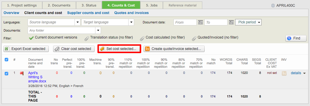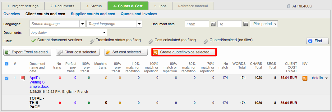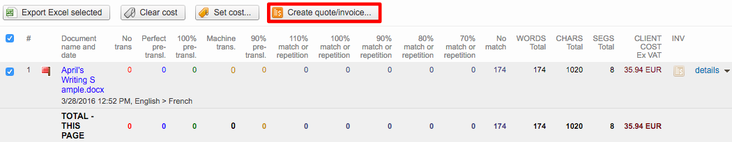 The document will now show the cost based on the number of words and pricelist information. The next step will be creating an quote for the proposal to the client.
