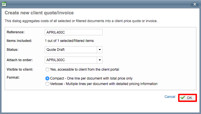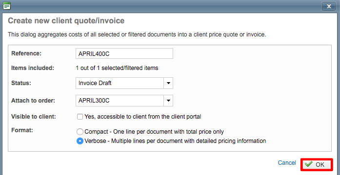 Next, choose Invoice Draft for the status. You can enable client access for viewing through the client portal and choose a format (compact or verbose). Click on OK to finish.