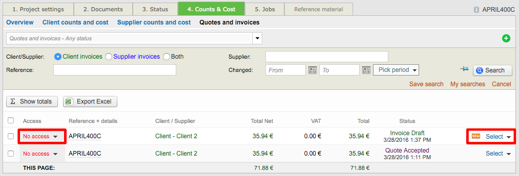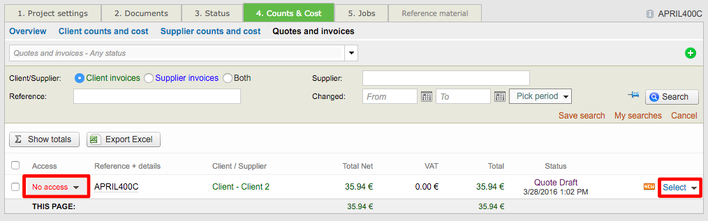 You will be redirected to the Quotes and Invoices section of the Counts & Cost Tab. To change access rights for the client, use the drop-down menu underneath the Access Column.