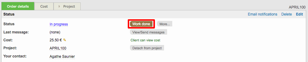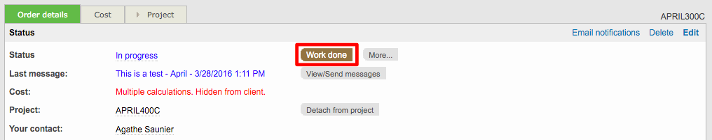 On the Order Details Tab, click on Work Done to send the completed work to the client for review and approval.