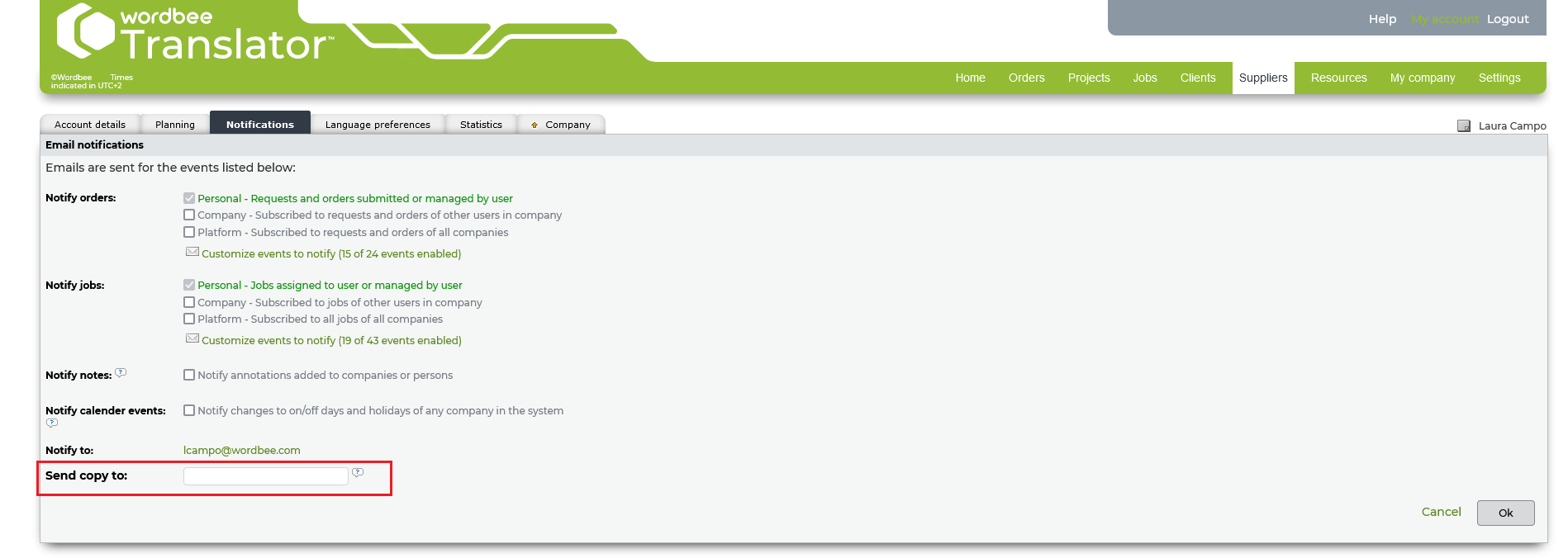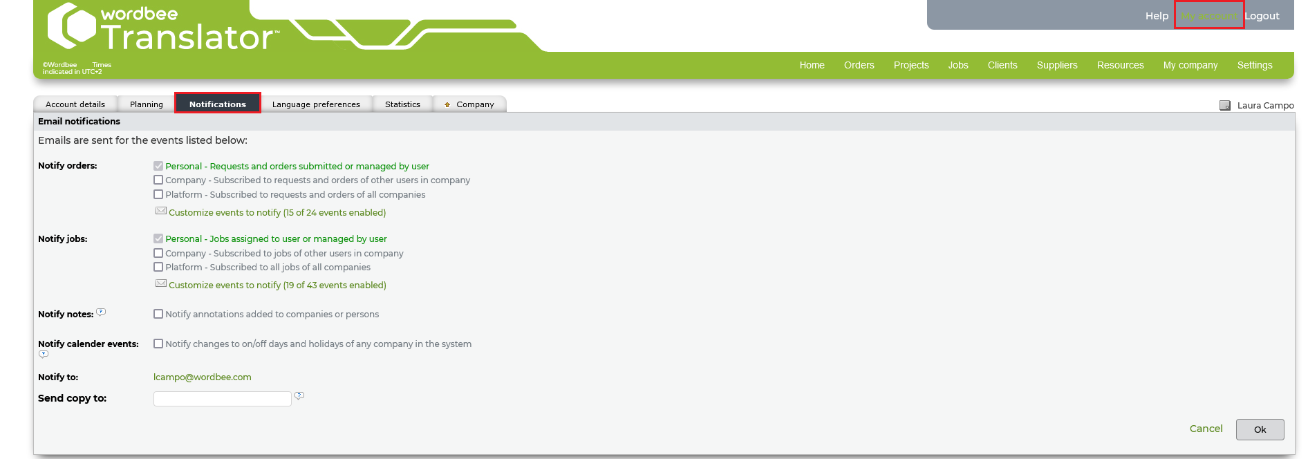 Each user profile has their own set of notifications, which can be individually configured to suit their needs. Depending on access rights, users will also be able to configure or preset the notifications for other users in the system (which could be handy when on-boarding a new client or supplier in the platform, so that they receive the relevant information on their mail boxes). Moreover, you can avoid sending some notifications if you know users are actively working in the Wordbee Translator platform.