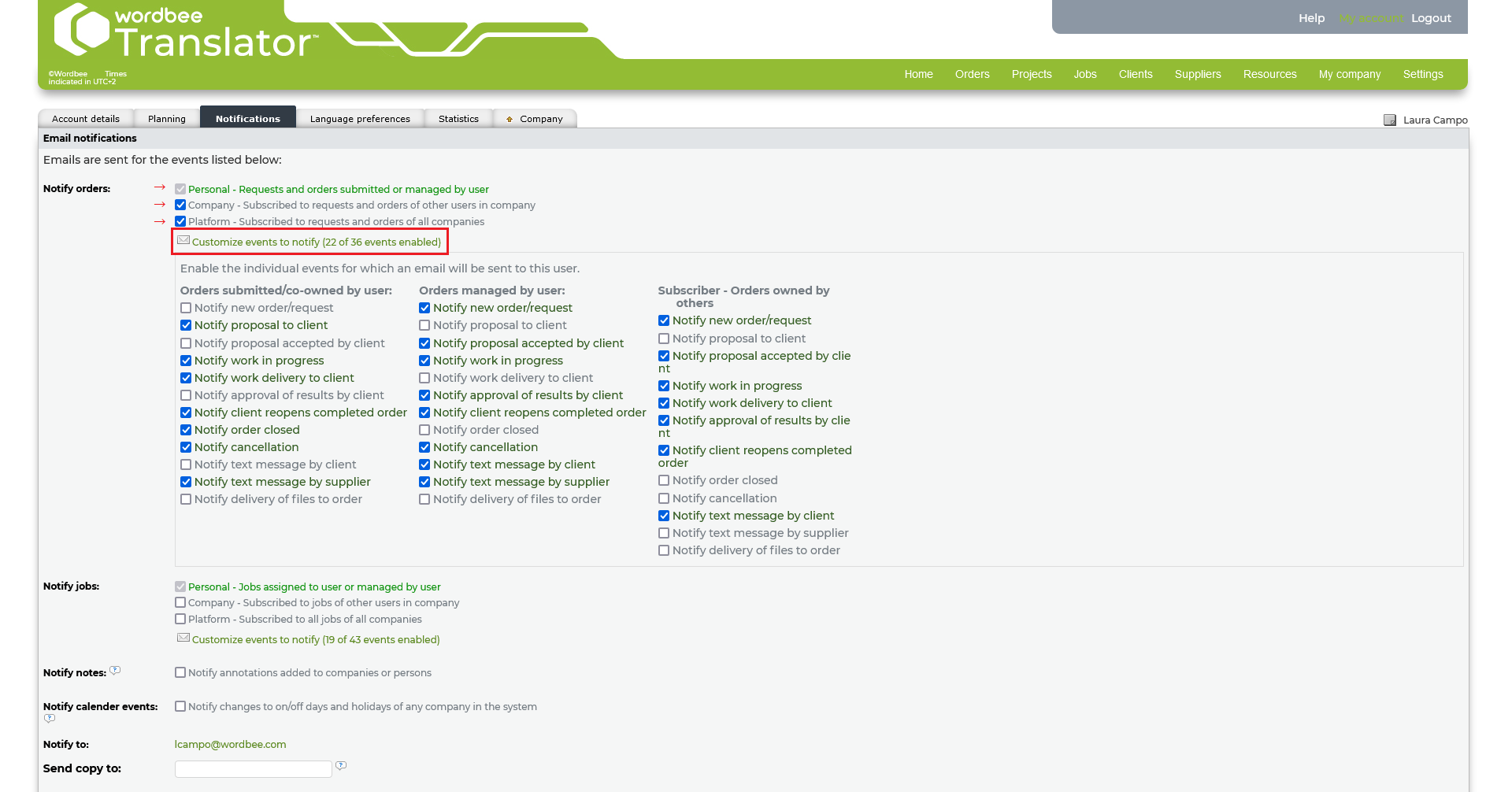 The system can let as a matter of fact let you subscribe to orders or jobs handled by other users within the same company or from all companies of the platform and subscribe to the events for which you want to be notified. This option shows only if the section "Company" or "Platform" is ticked.
