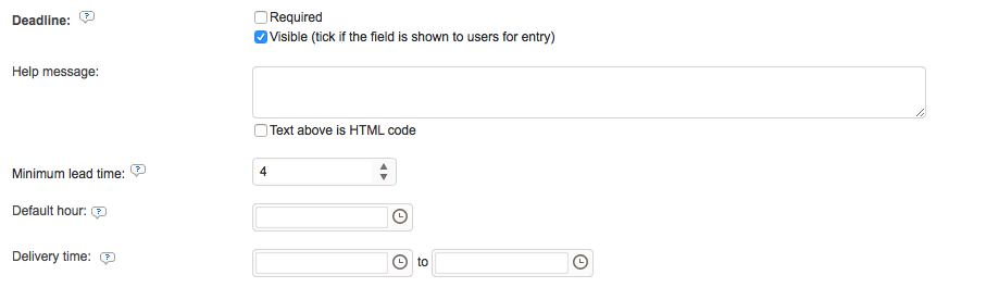 The Deadline settings may be used to configure whether or not a deadline is required, visible to the client on the form. Additionally you may configure a minimum lead time, default hour, and default delivery time for the order. By default, a deadline is not required to sumbit the order, but is a visible item on the order form with a minimum lead time of 4 hours.