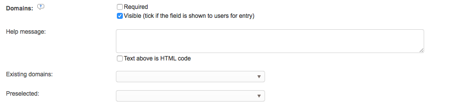 Next, you are able to configure the Domains that apply when the client chooses this option. This section must only be configured and visible if it is relevent. By default, the Domains are viewable on the form, but not required.