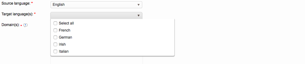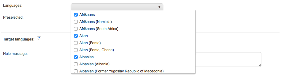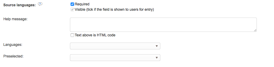 For example, if the client always requests that files consisting of English as the source language are translated, then this language could automatically be selected in the Preselected configuration setting to ensure it is automatically selected during form submission.