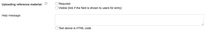Additionally, you may require or give the option of Uploading Reference Material to the client. By default this information is not required or visible to the client on the order form when the option is chosen. To make it visible or required, tick the checkbox next to the appropriate option, add a help message, and mark the text as HTML code if desired.