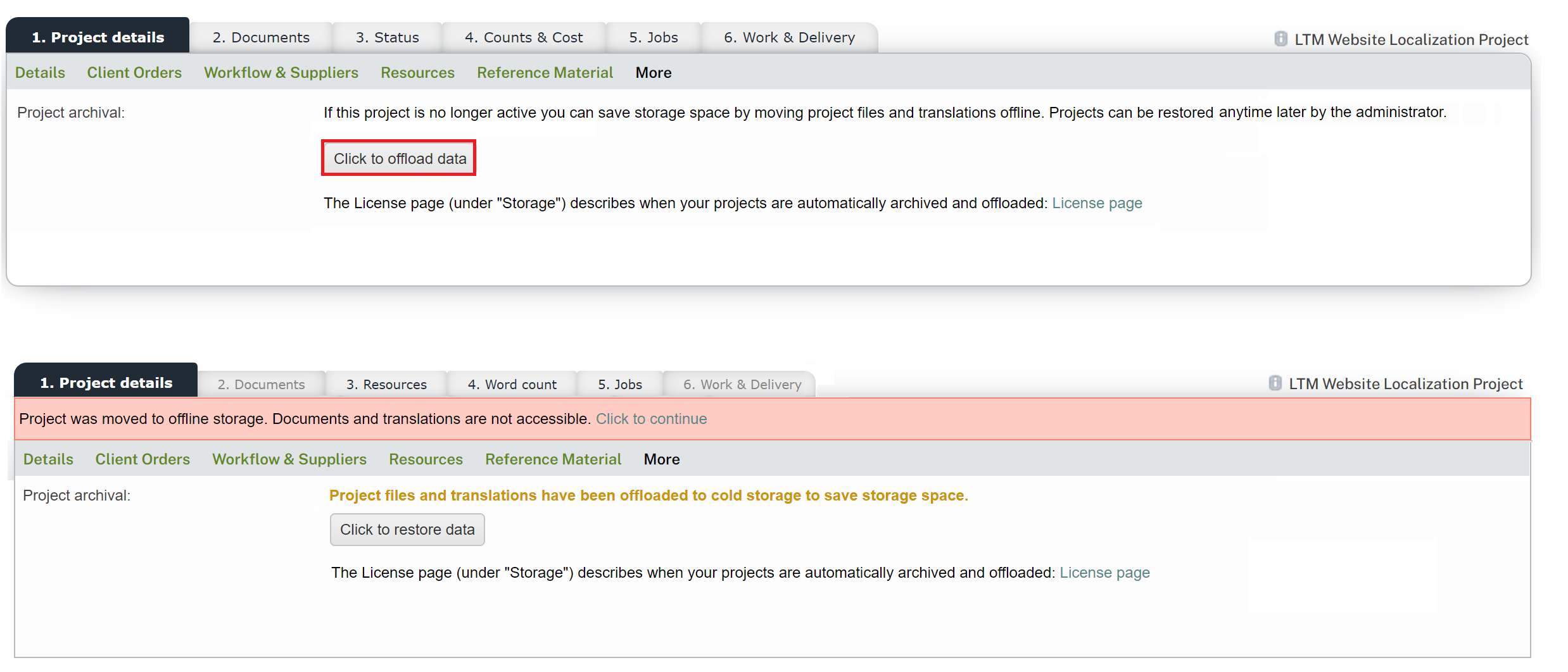 Utilize archived project material for training purposes or as a point of reference, aiding new projects and team members in understanding project specifics. - Manage the space available in the online Wordbee Translator platform (as per subscription details), with the option to manually recover offloaded projects on demand. More space for the online platform can always be purchased if required.