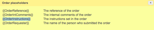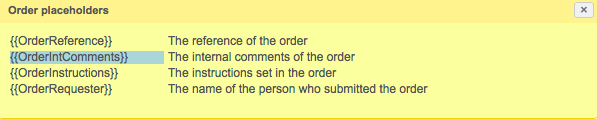 An additional placeholder is provided for use in any section and is titled {{OrderRequester}}. This may be placed in the Instructions, Internal Comments, or even as part of the Reference information.