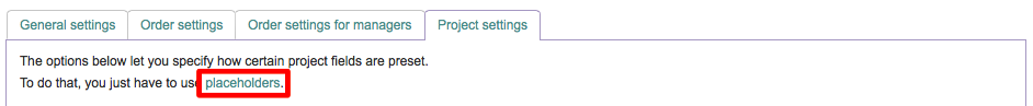 The Project Settings Tab of your custom order form will only be present if you have checked the Create Project Setting for the option on the General Settings Tab. These settings are specifically for configuring how the project fields are preset on the form. Placeholders are provided to make this configuration easier and may be viewed by clicking on Placeholders in the text located above the Project Fields header.