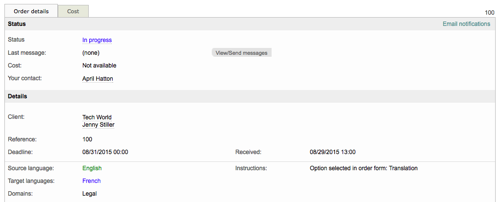 External clients will not be able to see all of this information. They may view the order by clicking on Orders in the toolbar and then clicking on Select next to the appropriate order. They will see the Contact Manager, Reference Number, Deadline, and Received Date, but will not be able to see items such as Internal Comments.