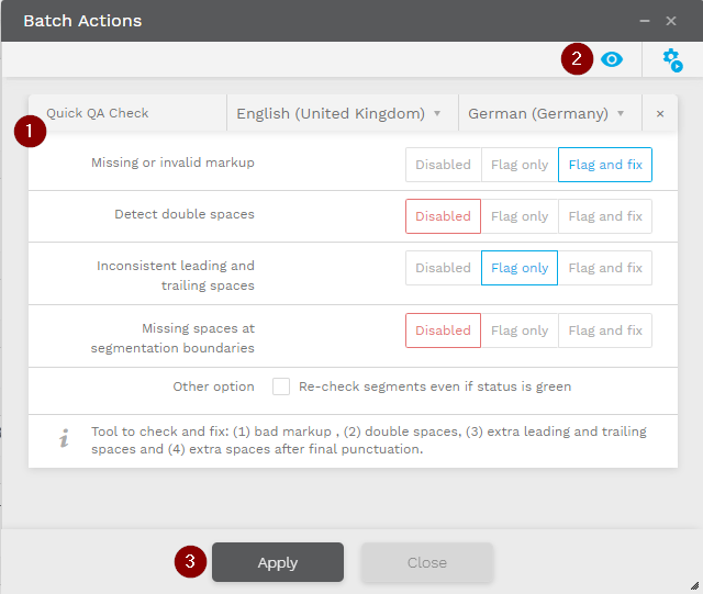 Users can set up the language pair for which they'd like to run this action. They then configure the different categories and define if the problems should only be flagged or if they should be fixed immediately. They also define if they want to exclude segments with green status from the check.