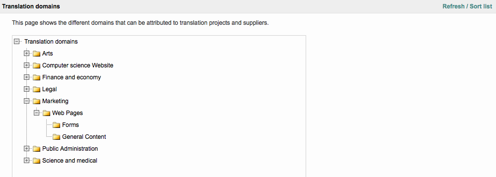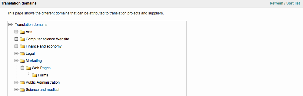 For this example we will be using the Marketing Translation Domain, which was part of the example shown on the Adding New Translation Domains page. The tree will appear as shown below when some of the available domains have been collapsed.