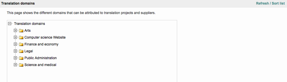 Please remember that Translation Domains functions as the parent node for all other domains. Each domain directly underneath it is considered to be a parent node (i.e. Translation Domains > Arts). Each subdomain under parent node is referred to as a child node (i.e. Arts > Architecture).