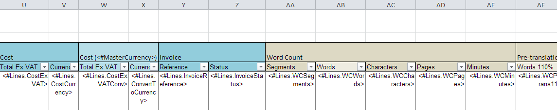 | <#Lines.WCFuzzy5> | Total words of fuzzy matches or repetitions without pre-translation. This is the 5th interval among 5 that can be configured in the word count profile. |