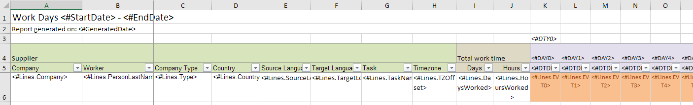 | Date columns | The Excel shows one column per day. The following placeholders are used for the titles of these columns. |