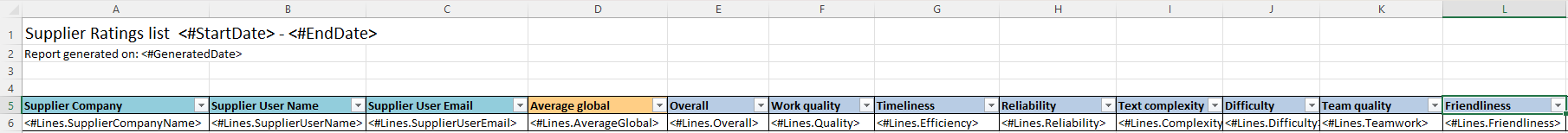 The report creates a line per internal and/or external supplier user (worker) and the average of the ratings associated with him/her.