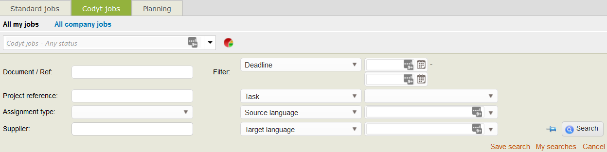 - Click on Search in one of the pages containing the tool (Projects, Jobs, Clients, Suppliers, Resources...)