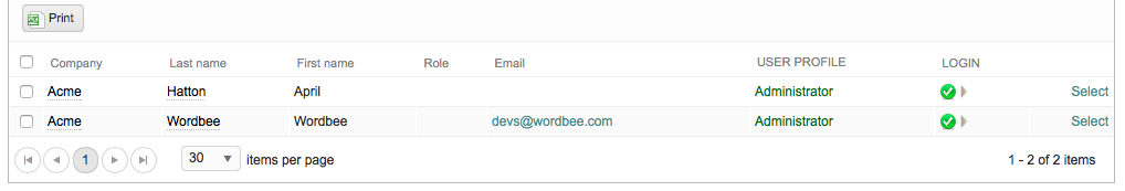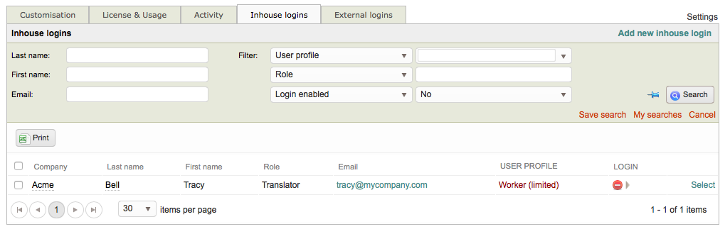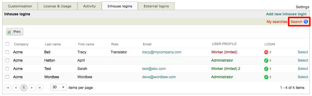 | Filters | Company - Locate and view user logins for a selected company in the system. User Profile - Locate and view user logins for a chosen profile in the system (i.e. Administrator, Manager, Worker (Limited), etc). Login Enabled - Locate and view only user logins with an enabled or disabled status in the system. Role - Locate and view only user logins with a specified role in the system (i.e. manager, translator, editor, etc.) Login - Type text for a user login and the system will display only logins matching the entered criteria. Last Login - Choose a date and the system will display only users who's last login matches that date. Phone - Locate and view only user logins with a specific phone number in the system. Phone Mobile - Locate and view only user logins with a specific mobile phone number in the system. Title - Locate and view only user logins with an entered title (i.e. Translator, Proofreader, etc.). |