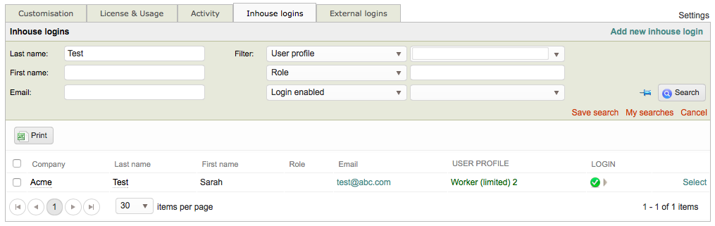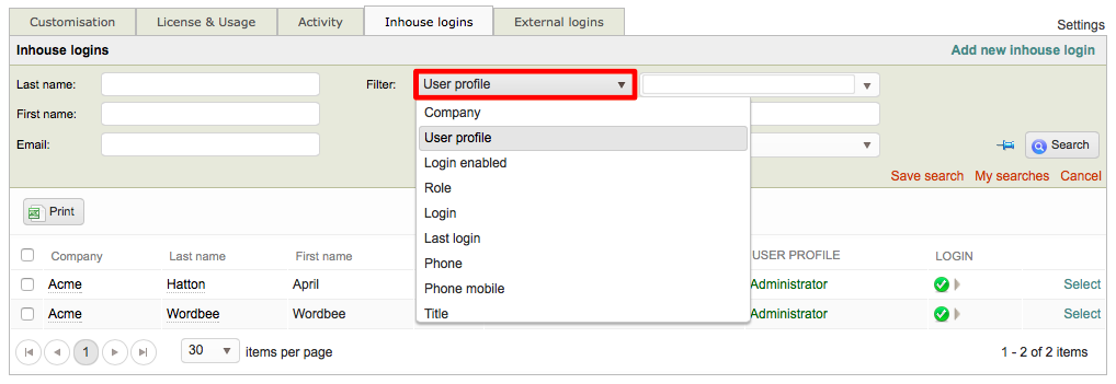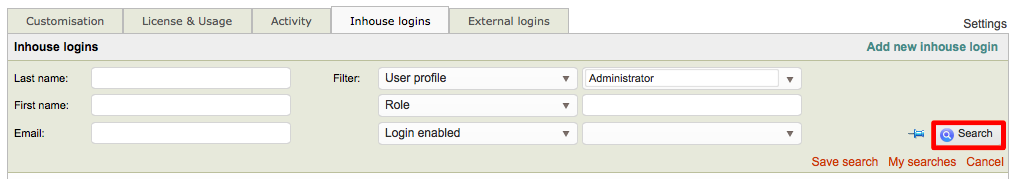 In this example, only two inhouse logins have the Administrator user profile.