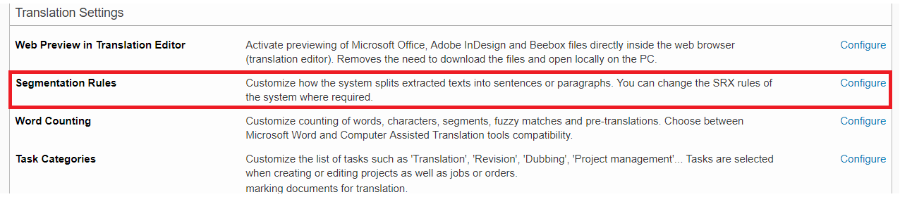 To access the current listing of SRX Rule (Text Segmentation) configurations in Wordbee Translator, click on Settings in toolbar. Then scroll down to the Translation Settings section and click on Configure to the right of Segmentation Rules.