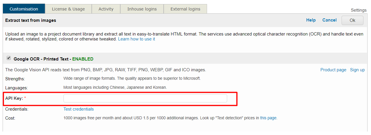 The OCR technology is provided by Google and Microsoft (more systems may be added in the future). You first need to subscribe with the MT providers and obtain the credentials to use them in Wordbee Translator. The free plans allow you to convert up to 5000 images per month.