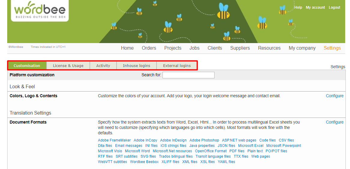 If you have administrative rights in Wordbee Translator, you can view and customize all aspects of your Wordbee platform by clicking on Settings.
