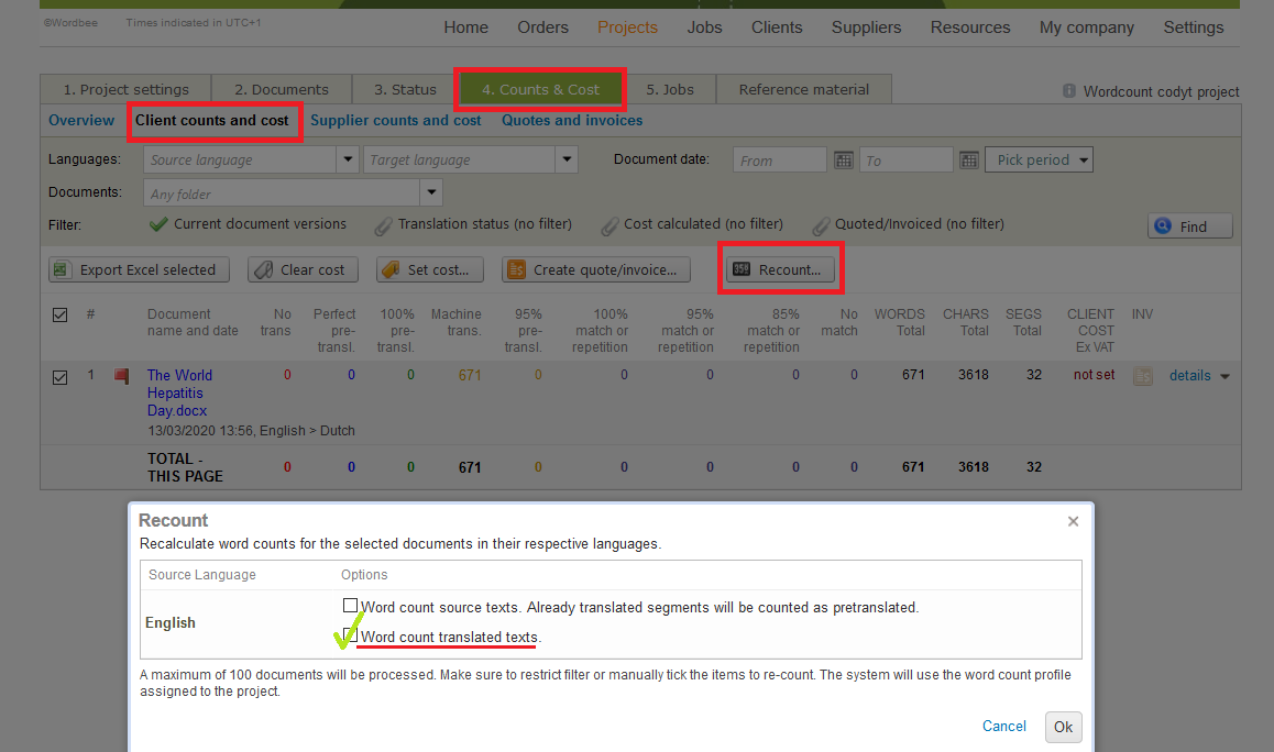 Wordbee is able to analyse your document to translate and automatically calculate its word count. By default, it is the number or source words that are being counted. If you want to know more about our default word counting, you can check our article on what is word counting and how to configure a customised profile.