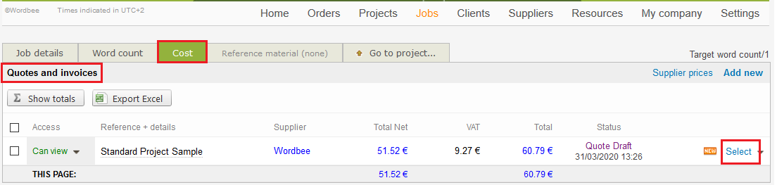 To invoice translated text reach the Cost tab in a Standard Project or the Counts & Cost tab in a Codyt Project, then click Select to modify the quote. The following steps apply to both type of projects.