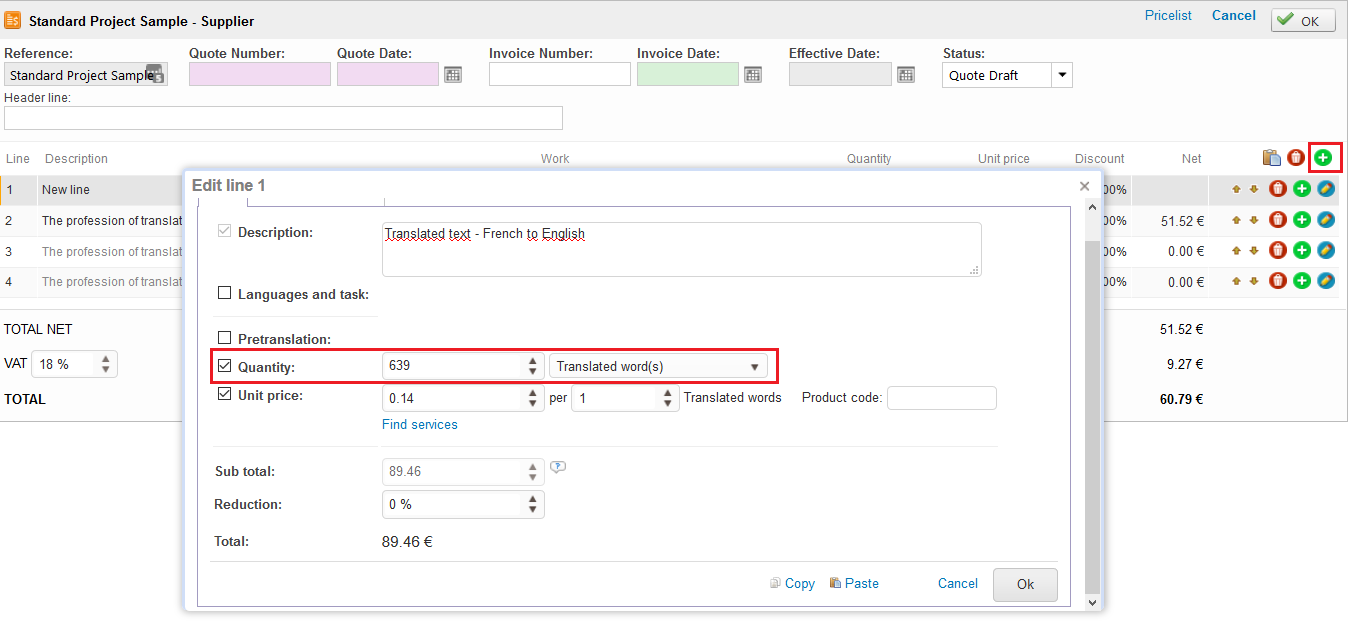 On edit mode, add a new line, give it a name and insert all the necessary information required. In the quantity, write the number of translated text, e.g. for our previous example 639 translated words. You can also charge this service as back-translation if this is in your price list. Make sure to also insert the unit price to have your new cost automatically calculated.