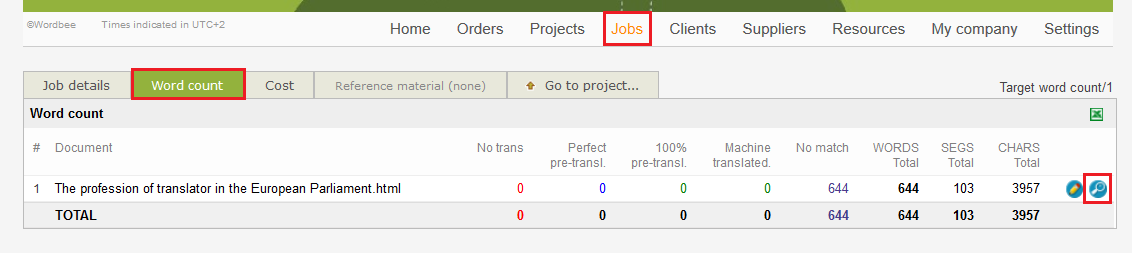 By clicking on the document “details”, a new window will pop up with the details of the word-count, including the number of translated words.