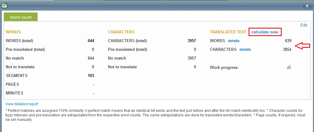 A new window will open, click on “calculate now” to count the number of translated text. In the example below, source word count is 644 whilst target word count is 639.