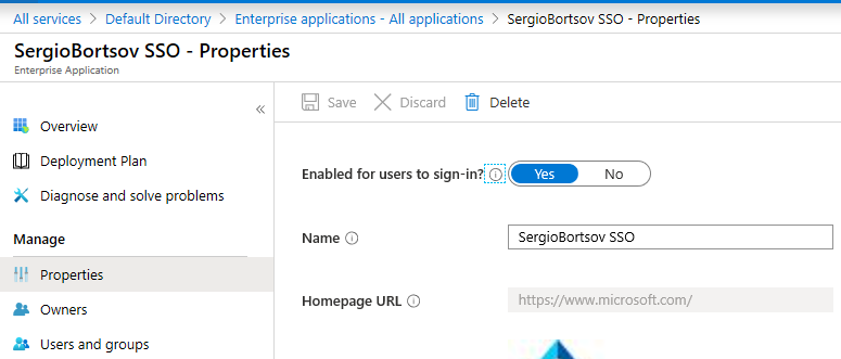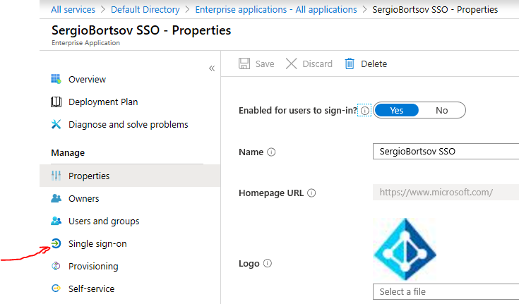 To add new application, select New application. In the Add from the gallery section, type Azure AD SAML Toolkit in the search box. Select Azure AD SAML Toolkit from results panel and then add the app. Wait a few seconds while the app is added to your tenant. Then you can click on just added Azure AD SAML Toolkit and go to Properties, and then change Name of the app to something more useful for you (eg “CompanyName SSO” etc). So now you would have something like this in the list