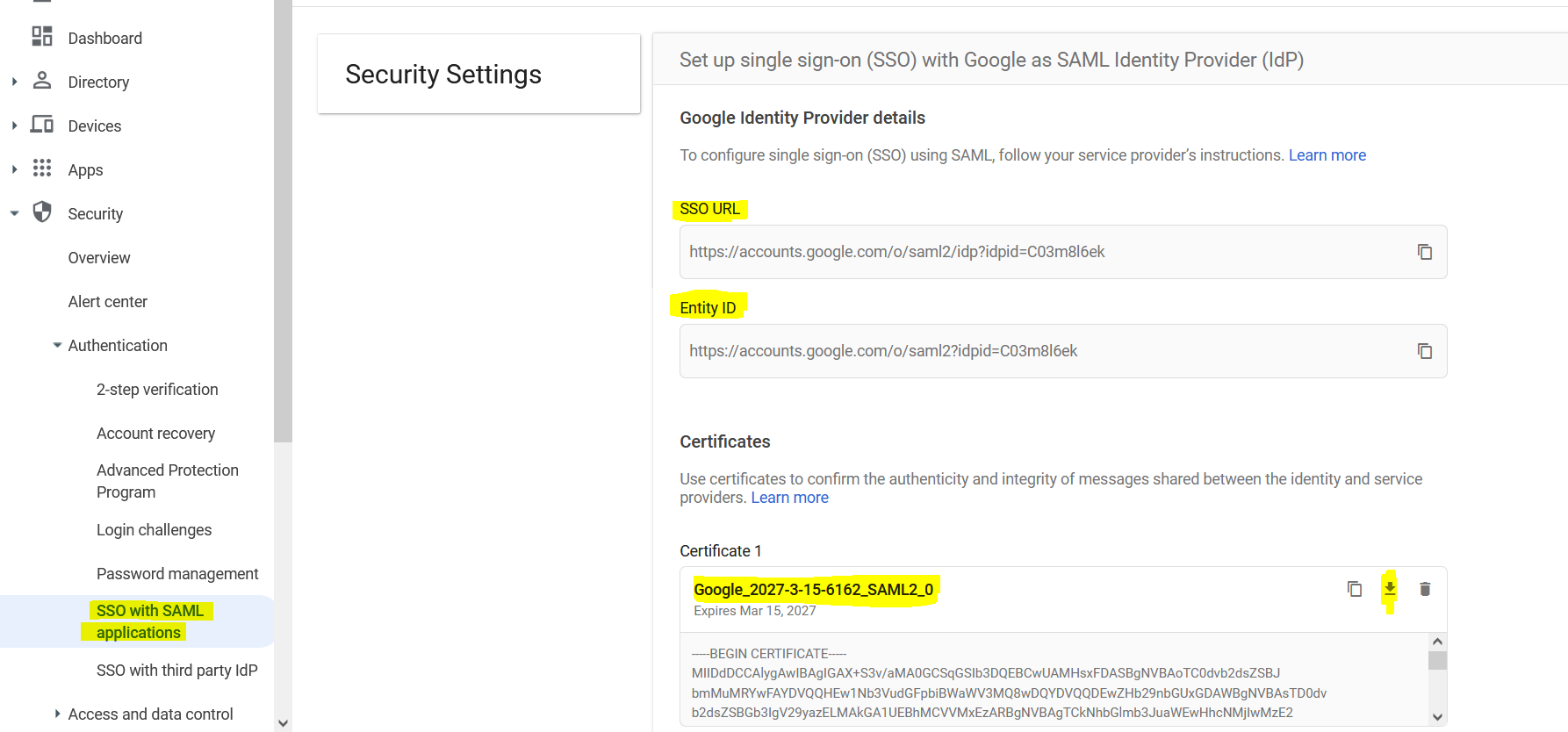 2- Go to Security > Authentication > SSO with SAML Applications