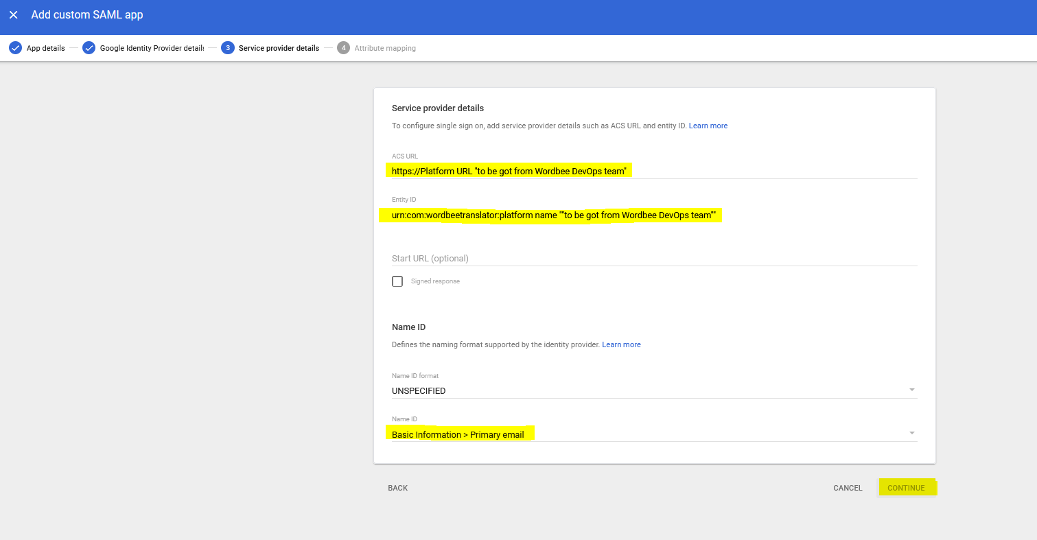 7- Add Acs URL and Entity ID “you should get them from Wordbee DevOps team“