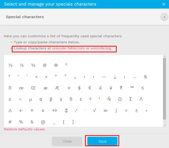 You also have the possibility to customize this panel by adding more characters and symbols. To do so, click on the pen icon and start typing the needed unicodes.