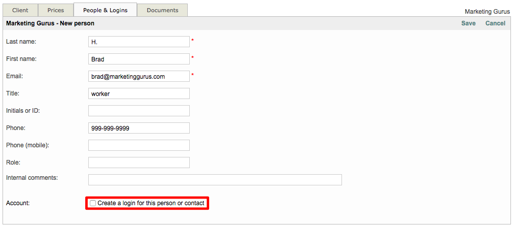User profiles determine what the user is allowed to see and do within the system when logged in. The People & Logins Tab provides access to every login for that client and can be used to make changes, disable logins, delete logins, remove users from the system, and to create new logins. The tab will appear as shown below: