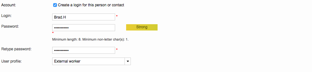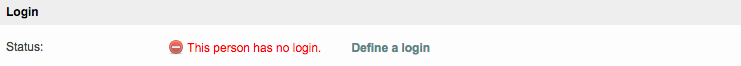 - Defining a Login - If the user has never had a log in set up in the system, you will see the message "This person has no login". Click on Define a login to set up a user ID and password for the person in the system.