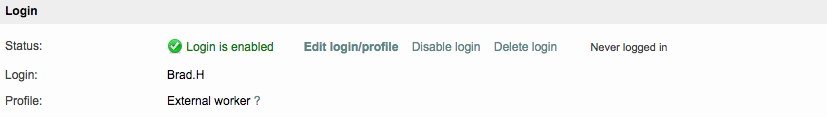 In the Login Section of this tab, several options are provided to manage user logins. Additional information is provided to show if the login is enabled and the last time the user logged into the system.
