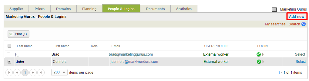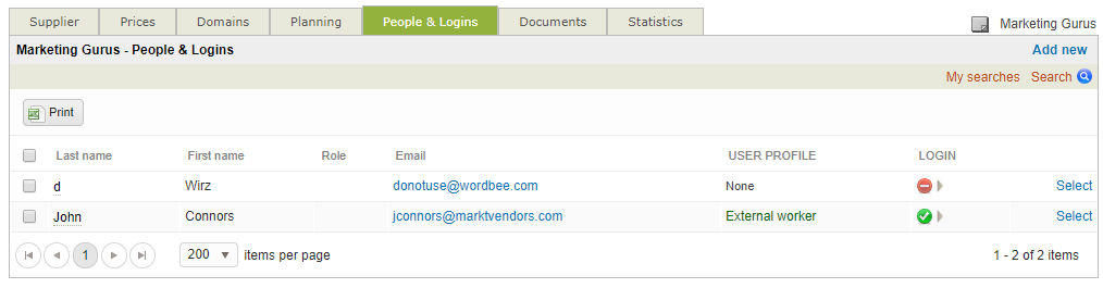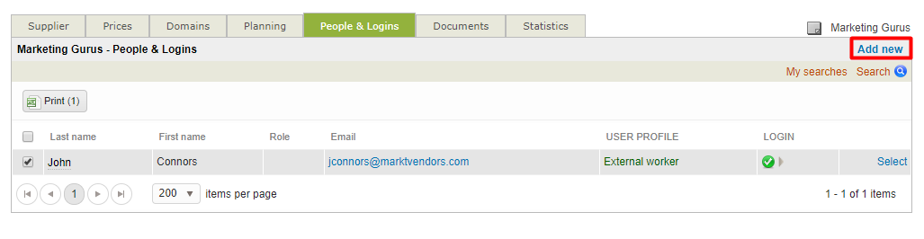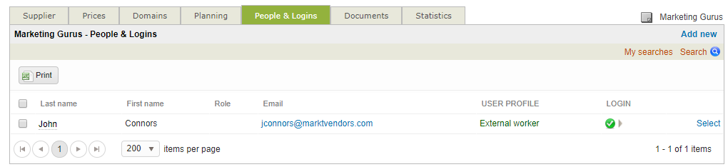 The People & Logins Tab displays a list of current user logins for the supplier. It can be used to view the information for a user, to make changes, to add new users, and to manage logins. To access it you will need to: