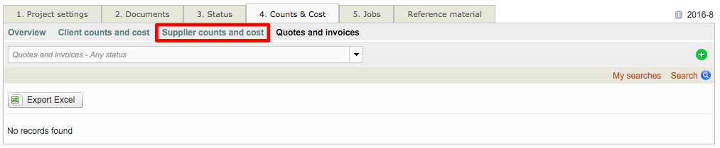 First, access the Counts & Costs Tab for the project. Then click on Quotes & Invoices to see if there are any existing invoices for the project. If no invoices exist for the project, the screen will appear as shown below. To create an invoice for a supplier, first, click on Supplier Counts and Cost.