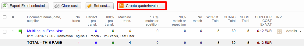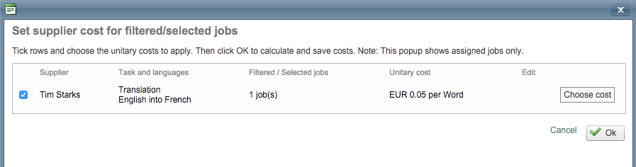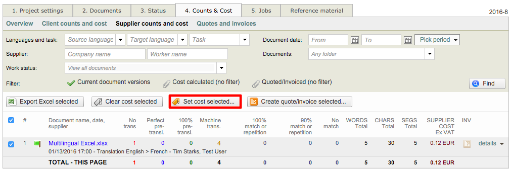 Then tick the checkbox for the appropriate item and click on Set cost selected... This will configure the cost for the document based on performed tasks, total word counts, and any entered discounts.