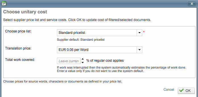 Another pop-up window will appear and can be used to choose a different pricelist, a different translation cost, and to enter a percentage for the regular costs that applies to the document. Click on OK to close this pop-up window and save any changes to the costing information. Then tick the checkbox for the supplier(s) and click on OK in the first pop-up window (shown above).