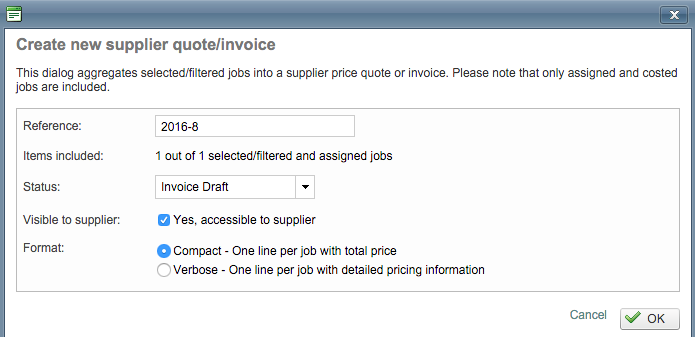 In the pop-up window, select Invoice Draft for the Status (or another applicable option in the drop-down menu). Next, tick the checkbox for the Yes, accessible to the supplier option if you have the client portal and want the supplier to be able to view the costing information when logged in.