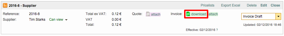 A Download option will then appear to the right of Invoice and can be used to download the attached invoice either internally or by the supplier (if permitted). Click on Close to exit the pop-up window.