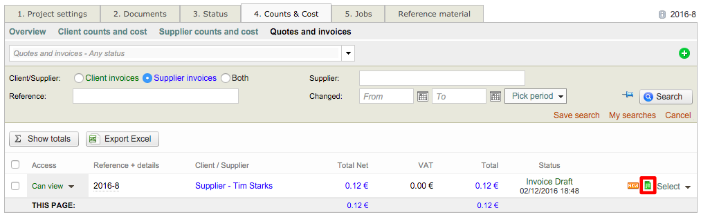 Now you will be able to see the invoice underneath Quotes and Invoices on the Counts & Costs Tab for the CoDyt project. The screen will automatically be refreshed after closing the above pop-up window. Click on Select to view the details of the invoice and Attach it as done in the Standard Project example.
